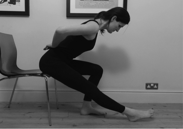 • Sit on the edge of a chair with one leg straight out in front of you and the other knee bent.