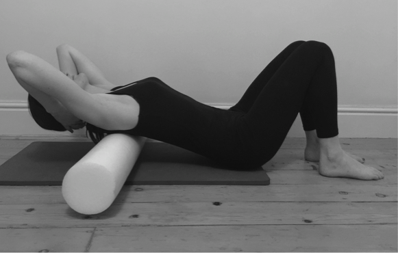 • Lie on your back with your knees bent and the foam roller at the level of your shoulder blades. Place your hands behind your head to support your neck.